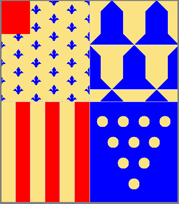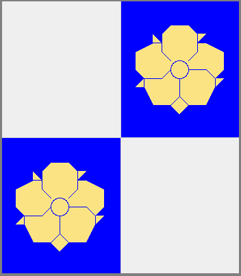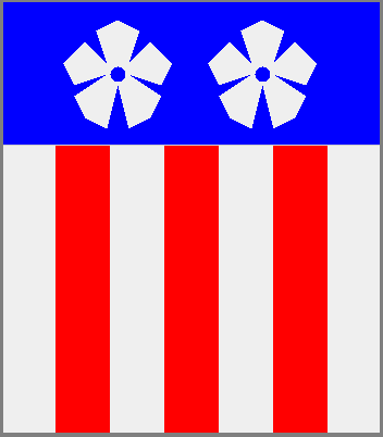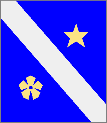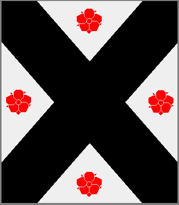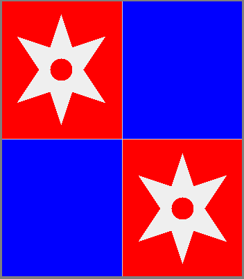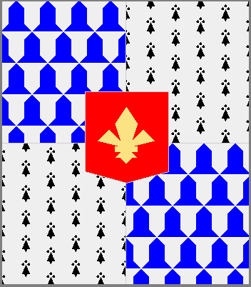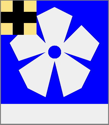 Ecartelé d'argent et d'azur, l'azur chargé d'une rose d'or (ecartele ((1 4) (argent plain)) ((2 3) (azur (rose or)))) |