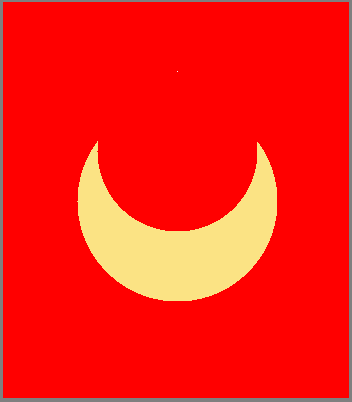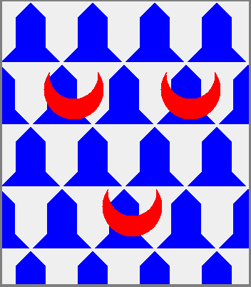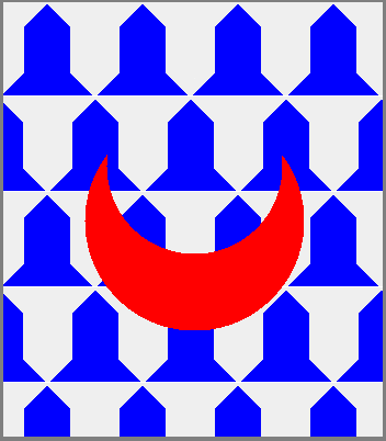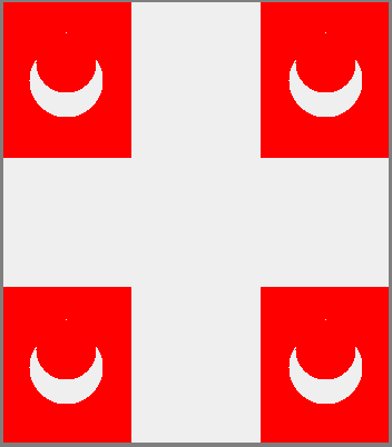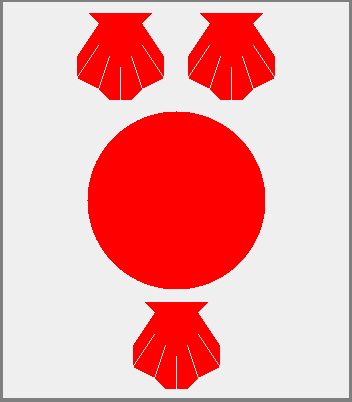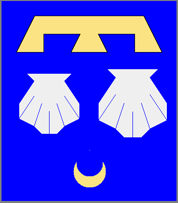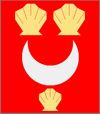 versées d'or (gueules (accompagne (croissant argent) (enChef (2 enFasce (coquille or verse))) (enPointe (coquille or verse)))) |