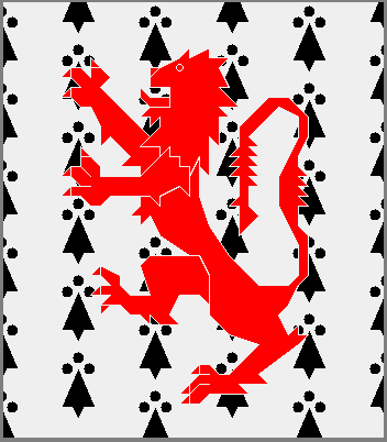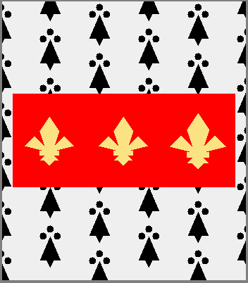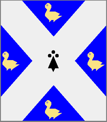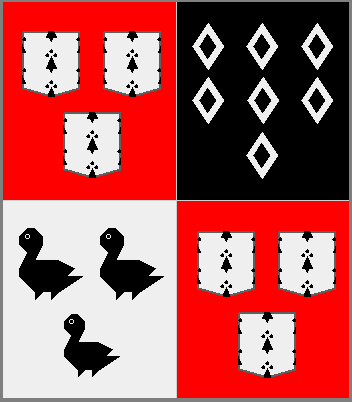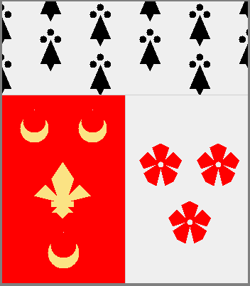 trois merlettes de sable (ecartele ((1 4) (gueules (3 (ecussons hermine)))) ((2) (sable (7 (macle argent)))) ((3) (argent (3 (merlette sable))))) |