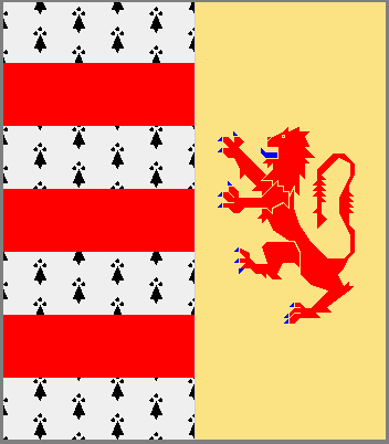 de gueules, armé et lampassé d'azur (parti (hermine (3 (fasce gueules))) (or (lion gueules (arme azur) (lampasse azur)))) |