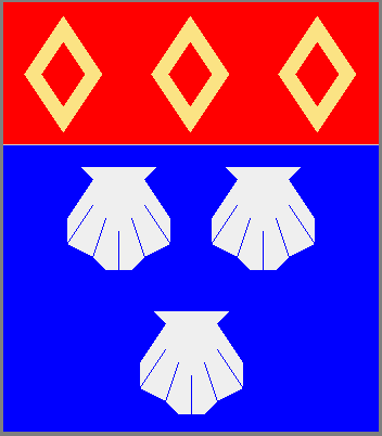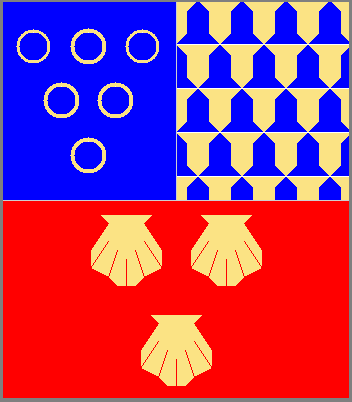 d'or et d'azur, au 2, de gueules à trois coquilles d'argent (coupe (parti (azur (6 (annelet or))) (vaire or azur)) (gueules (3 (coquille or)))) |