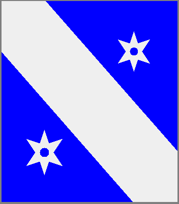 D'azur à la bande d'argent accompagnée de deux molettes de même (azur (accompagne (bande argent) (2 (molette argent)))) |