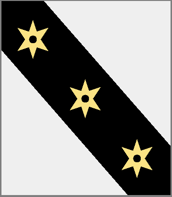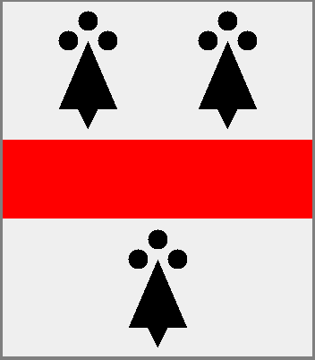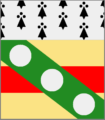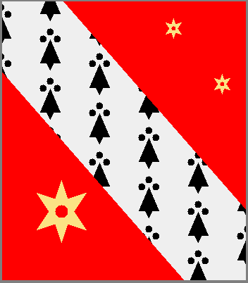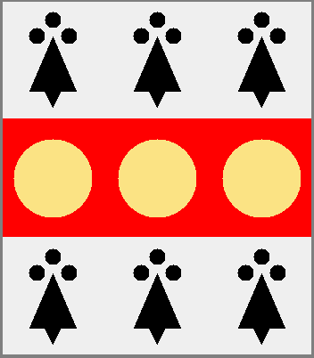accompagnée de six moucheture d'hermine, 3 et 3 (argent (accompagne (charge (fasce gueules) (3 enFasce (besant or))) (enChef (3 enFasce (moucheture sable))) (enPointe (3 enFasce (moucheture sable))))) |