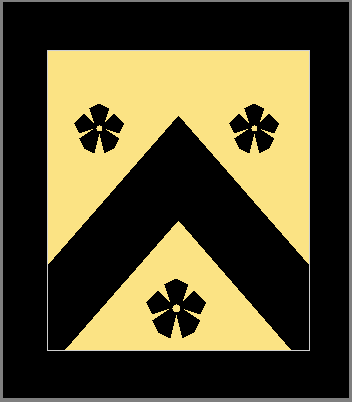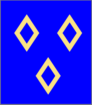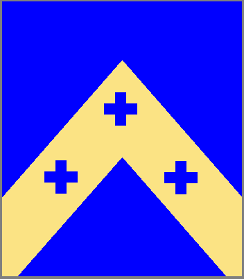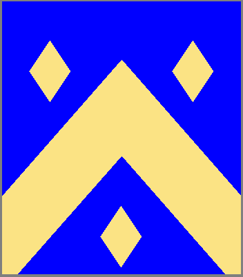 D'azur au chevron d'or accompagné de trois losanges du même (azur (accompagne (chevron or) (3 (losange or)))) |