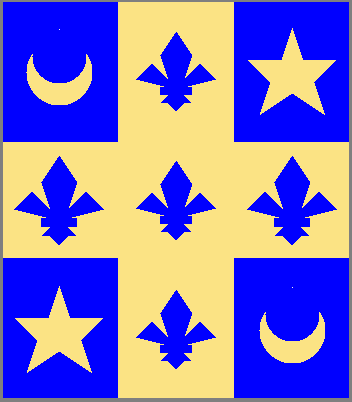 Parti: au 1, de gueules à une fleur de lys accompagnée de trois croissants,
