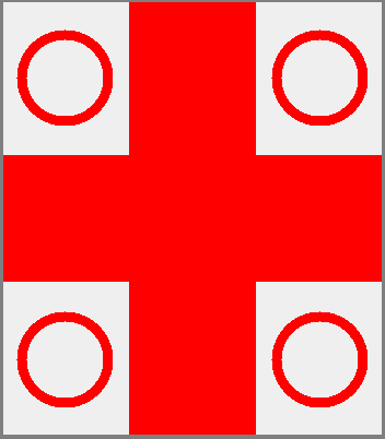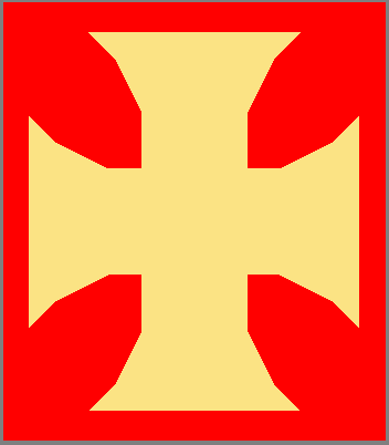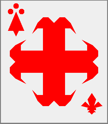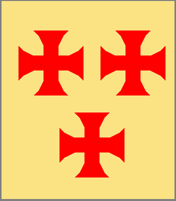 de gueules à trois mâcles d'argent (brochant (taille (argent (croisette-pattee gueules)) (gueules (croix-de-Malte argent))) (charge (canton-chef-senestre gueules) (3 (macle argent)))) |