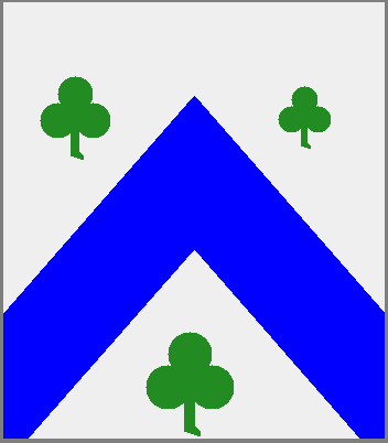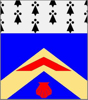 d'une coquille du même; au chef d'hermine ((azur (accompagne (charge (chevron or) (chevron gueules)) (enPointe (coquille gueules)))) (chef hermine)) |