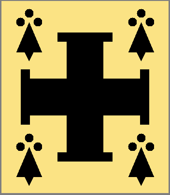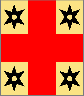 D'or à la croix de gueules cantonnée de quatre molettes de sable (or (accompagne (croix gueules) (4 (molette sable)))) |