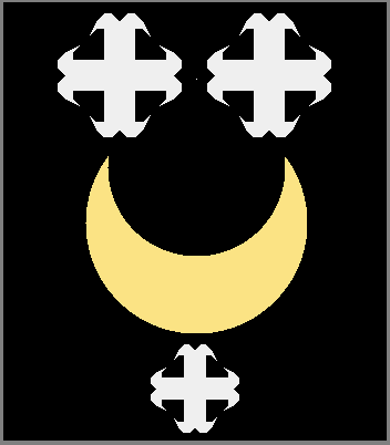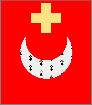 De gueules au croissant d'hermine surmonté d'une croisette d'or (gueules (accompagne (croissant hermine) (enChef (croisette or)))) |