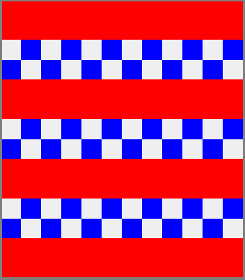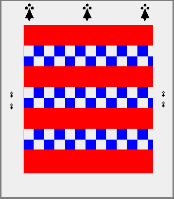 De gueules à trois fasce échiquetées d'argent et d'azur (gueules (3 (fasce (echiquete 2 argent azur)))) |