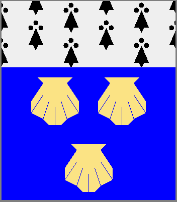 D'azur à trois coquilles d'or; au chef d'hermine ((azur (3 (coquille or))) (chef hermine)) |