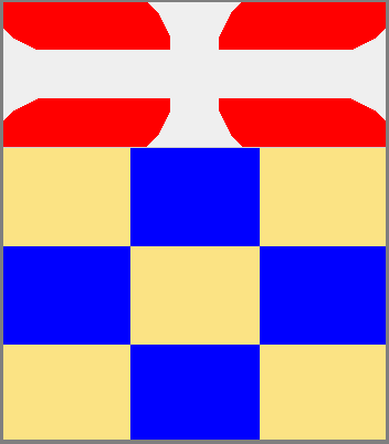 d'une croix pattée d'argent ((echiquete 3 or azur) (charge (chef gueules) (croix-pattee argent))) |