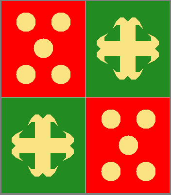 aux 2 et 3, de sinople à la croix ancrée alésée d'or (ecartele ((1 4) (gueules (5 (range 2 1 2) (besant or)))) ((2 3) (sinople (croix-ancree or)))) |