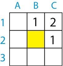 - Complétez la grille de l'alpiniste ci-contre de taille 3 × 3 (un nombre et un seul par case de 1A à 3C) de sorte que la case jaune (2B) contienne le pic le plus grand possible.