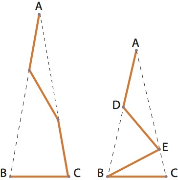 Elle continue ses travaux avec le même mètre articulé et, cette fois, le « colle » autrement (disposition de droite), le triangle ABC étant toujours isocèle.